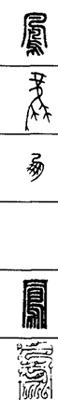 〈辨〉凤字甲骨文有二体,一为象形字,羽冠丰,尾俱全;一为形声字,在象形字上加凡为声符。金文为形声字,略同甲骨文。战国古文有二,一为象形字,从甲骨文象形字讹变而来,楷书作朋,后用为朋友字,读péng;一为形声字,在象形字上又加形符鳥,楷书作鵬,简化作鹏,后用为大鹏字,读péng。篆书为形声字,从鳥凡声,楷书作鳳,简化作凤。朋、鹏、凤三字同源,但后来用途各异。