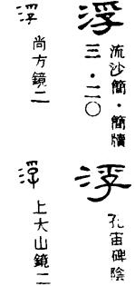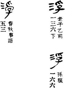 》:“摘莲抛水上,郎意在浮花。”也指飘在空中。《论语·述而》:“不义而富且贵,于我如浮云。”引申为在水上航行,游水。屈原《九章·哀郢》:“将运舟而下浮兮,上洞庭而下江。”苏轼《日喻》:“七岁而能涉,十岁而能浮,十五而能没矣。”(没:潜水。)②虚浮无定。鲍照《松柏篇》:“人生浮且脆,鸩若晨风悲。”又为虚浮不实。《尚书·盘庚上》:“汝曷弗告朕,而胥动以浮言。”(曷:何。胥:相。动:鼓动。)引申为空,虚。李渔《闲情偶寄·颐养·行乐》:“予绝意浮名,不干寸禄。”(干gān:求取。)③浮躁,轻浮。《国语·楚语上》:“教之乐,以疏其秽而镇其浮。”高适《淇上酬薛三据兼寄郭少府》:“皇情念淳古,时俗何浮薄。”④超过。《尚书·泰誓中》:“惟受罪浮于桀。”(受:商纣王名。)《礼记·表记》:“先王谥以尊名,节以壹惠,耻名之浮于行也。”⑤罚人饮酒。《晏子春秋·杂下》:“景公饮酒,田桓子侍,望见晏子而复于公曰:‘请浮晏子。’”(复:告。)《说苑·善说》:“饮不釂者,浮以大白。”(釂jià0:饮尽。白:罚饮用的酒杯。)引申为满饮。方岳《水调歌头·九日多景楼》:“天地几今夕,举白与君浮。”⑥浮脉。中医脉象名。《素问·阴阳应象大论》:“按尺寸,观浮、沉、滑、濇而知病所以治。”(尺寸:指尺脉和寸脉。)⑦瓠,葫芦。《淮南子·说山》:“百人抗浮,不若一人挈而趋。”(抗:举。)⑧[浮屠]1.佛教语。佛陀,佛。《后汉书·楚王英传》:“晚节更喜黄老,学为浮浮斋戒祭祀。”(晚节:晚年。黄老:黄帝和老子。指代道家。)也指佛教。范缜《神灭论》:“浮浮害政,桑门蠹俗。”(桑门:指僧侣。)又指僧人。韩愈《送浮屠文畅师序》:“夫文畅,浮浮也。”又指佛塔。苏轼《荐诚禅院五百罗汉记》:“且造铁浮浮十有三级,高百二十尺。”2.伞顶,旗顶。因形状似塔而得名。《金史·仪卫志下》:“伞制,皇太子三位妃皆青罗表紫里,金浮浮。”《明史·流贼传·李自成》:“自成独白鬃大纛银浮浮。”(纛dào:军中大旗。)