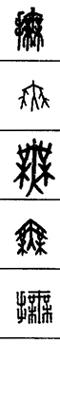 从上到下依次是小篆、甲骨文、金文、古玺及战国文字、缪篆及汉代文字、鸟虫篆。