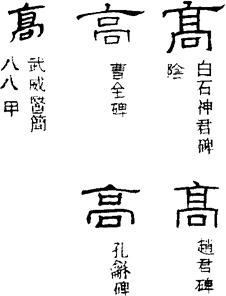 甲骨文、金文的高字,象楼阁层叠的形状:其上部是斜顶的屋宇,下部为楼台,中间的口则表示进入楼台的门。以楼阁的高耸来表示崇高之意而与低、卑相对,这就是高字的本义。引申为高大、高远、高深以及加高、提高等义;又指年老,如高龄;再进一步引申为抽象的高尚、高明、高洁等义。