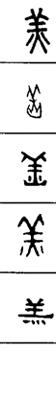 从上到下依次是小篆、甲骨文、金文、古玺及战国文字、缪篆及汉代文字、鸟虫篆。