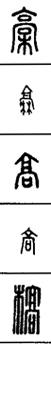 从上到下依次是小篆、甲骨文、金文、古玺及战国文字、缪篆及汉代文字、鸟虫篆。