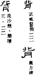 〈辨〉背字声符北,古文字字形象二人背对背之形,详北字下,可以引申出违背义,也可以引申出脊背义。后为脊背义造背,加肉为形符。背2异体揹,更从手为形符。今并作背。