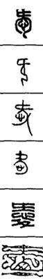 从上到下依次是小篆、甲骨文、金文、古玺及战国文字、缪篆及汉代文字、鸟虫篆。