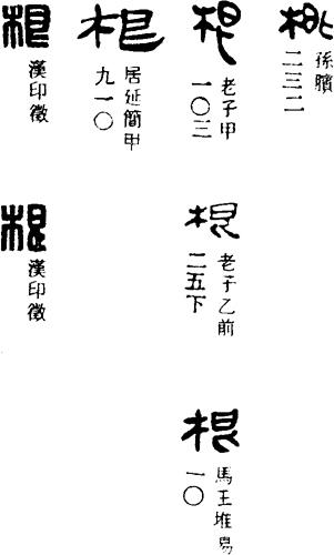 ①草木的根。《左传·隐公六年》:“绝其本根,勿使能殖。”《荀子·劝学》:“兰槐之根是为芷。”(兰槐:香草名,即白芷。)引申为物体的下基。庾信《明月山铭》:“风生石洞,云出山根。”②事物的本源。《老子》第六章:“玄牝之门,是谓天地根。”(玄牝:道家指衍生万物的本源。)《淮南子·精神》:“精神入其门,而骨骸反其根,我尚何存?”③根除,彻底清除。《管子·君臣下》:“审知祸福之所生,是故慎小事微,违非索辩以根之。”《后汉书·西羌传》:“羌虽外患,实深内疾,若攻之不根,是养疾疴于心腹也。”④量词。《齐民要术·种槐柳楸梓梧柞》:“一亩,二千一百六十根。”《水经注·沁水》:“庙侧有攒柏数百根。”