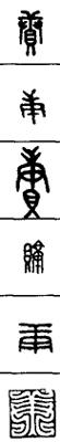 从上到下依次是小篆、甲骨文、金文、古玺及战国文字、缪篆及汉代文字、鸟虫篆。