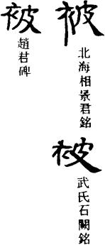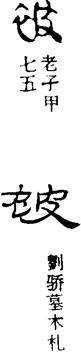 馬王堆帛書《老子》甲本《德經》:“〔是以聖人自知而不自見也,自愛〕而不自貴也,故去被取此。”被乙本作罷,通行本作彼。按被與彼通,《隸釋》靈臺碑“德彼四表”、“廣彼之恩”,洪适釋以彼為被。《荀子·宥坐》:“還復瞻被九蓋皆繼,被有説邪?”楊倞注:“被皆當為彼”。