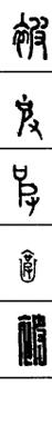 从上到下依次是小篆、甲骨文、金文、古玺及战国文字、缪篆及汉代文字、鸟虫篆。