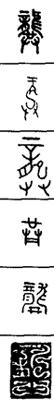 从上到下依次是小篆、甲骨文、金文、古玺及战国文字、缪篆及汉代文字、鸟虫篆。