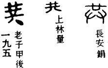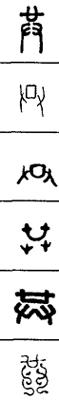 从上到下依次是小篆、甲骨文、金文、古玺及战国文字、缪篆及汉代文字、鸟虫篆。