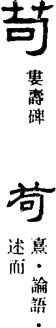 ①苟且,不严肃。《论语·子路》:“君子于其言,无所苟而已矣。”《礼记·曲礼上》:“临财毋苟得,临难毋苟免。”今成语有“一丝不苟”、“不苟言笑”。②姑且,暂且。诸葛亮《出师表》:“苟全性命于乱世,不求闻达于诸侯。”马中锡《中山狼传》:“今日之事,何不使我得早处囊中,以苟延残喘乎?”③或许,庶几。《诗经·王风·君子于役》:“君子于役,苟无饥渴。”(于:词头。)④连词。常用在偏句的开头,表示条件或假设。《左传·成公二年》:“自始合,苟有险,余必下推车。”《战国策·齐策四》:“苟无岁,何以有民?苟无民,何以有君?”(岁:年成,收成。)