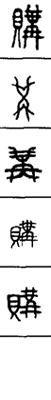 从上到下依次是小篆、甲骨文、金文、古玺及战国文字、缪篆及汉代文字、鸟虫篆。