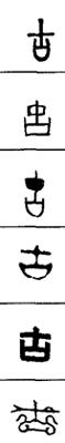 从上到下依次是小篆、甲骨文、金文、古玺及战国文字、缪篆及汉代文字、鸟虫篆。