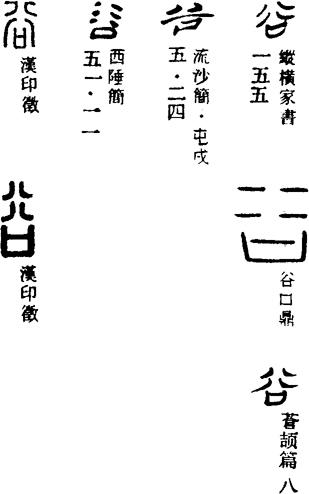 【说明】“谷”为会意字,字的上部是“水”字的一半,下部的“口”表示泉眼,组合在一起表示水从泉眼里流出来。参附录三。