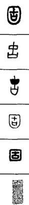 从上到下依次是小篆、甲骨文、金文、古玺及战国文字、缪篆及汉代文字、鸟虫篆。