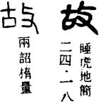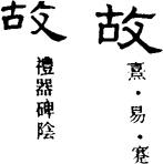 ㈠gù ①事。如:变故。②原因。如:原故。③从前;本来。如:故土。④久;归。如:故交;故宫。⑤故事;成例。《国语·鲁语上》:“非故也。”(非故,不合老规矩。)⑥死亡。如:病故。⑦巧伪。《淮南子·主术训》:“上多故则下多诈。”⑧故意。如:故作镇静。⑨固;毕竟。《世说新语·品藻》:“故当胜耳。”⑩仍旧;依然。如:依然·故我。⑾所以;因此。如:因下雨,故未如期起程。⑿通“顾”。反而。《史记·赵世家》:“小弱故能得之于强大。”