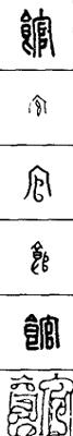 从上到下依次是小篆、甲骨文、金文、古玺及战国文字、缪篆及汉代文字、鸟虫篆。