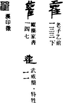 雚是一个象形字。古文字的雚字,象一头顶有长羽毛、双目突出的鸟形,其本义指一种生活在水边的小鸟。《说文解字》:“雚,小爵也。”今通作“鹳”。