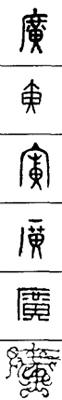 从上到下依次是小篆、甲骨文、金文、古玺及战国文字、缪篆及汉代文字、鸟虫篆。