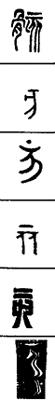 从上到下依次是小篆、甲骨文、金文、古玺及战国文字、缪篆及汉代文字、鸟虫篆。