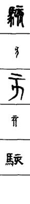 从上到下依次是小篆、甲骨文、金文、古玺及战国文字、缪篆及汉代文字、鸟虫篆。