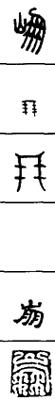 从上到下依次是小篆、甲骨文、金文、古玺及战国文字、缪篆及汉代文字、鸟虫篆。