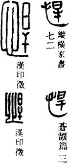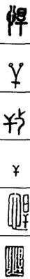 从上到下依次是小篆、甲骨文、金文、古玺及战国文字、缪篆及汉代文字、鸟虫篆。