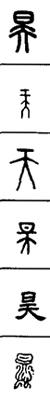 从上到下依次是小篆、甲骨文、金文、古玺及战国文字、缪篆及汉代文字、鸟虫篆。