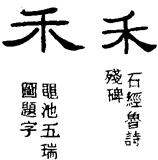 〈辨〉禾字甲金文为象形字,象谷子植株,穗垂而弯;篆书讹变,楷书作禾。用为偏旁,表示农作物及农事,偶尔也作声符。