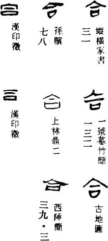 从上到下依次是小篆、甲骨文、金文、古玺及战国文字、缪篆及汉代文字、鸟虫篆。