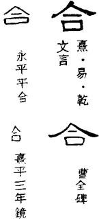 (一)hé 《广韵》:合,同,亦器名。亦六合,天地四方。对也。 侯阁切 咸开一入合匣