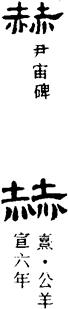【说明】“赫”为会意字,由二“赤”字组合而成,表示火红的颜色。
