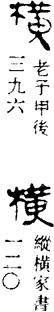 ㈠ héng ①横的方向,与“纵”相对。《淮南子·览冥》:“纵横间之,举兵而相角。”引申为横向,横放着。《吕氏春秋·贵直》:“行人烛过免胄横戈而进。”(行人:官名。胄:头盔。)又特指战国时期“连横”,主张东方六国分别与秦结盟。《战国策·秦策一》:“苏秦始将连横说秦惠王。”②不循正道,交错。《孟子·滕文公上》:“洪水横流,泛滥于天下。”刘向《九叹·忧苦》:“涕横流而成行。”③充溢。《礼记·祭义》:“溥之而横乎四海。”(溥fū:分布。)《吕氏春秋·适音》:“以荡听巨则耳不容,不容则横塞。”