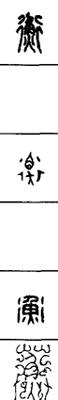 从上到下依次是小篆、甲骨文、金文、古玺及战国文字、缪篆及汉代文字、鸟虫篆。