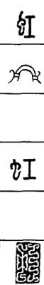 从上到下依次是小篆、甲骨文、金文、古玺及战国文字、缪篆及汉代文字、鸟虫篆。