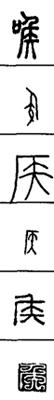 从上到下依次是小篆、甲骨文、金文、古玺及战国文字、缪篆及汉代文字、鸟虫篆。