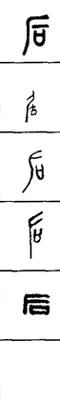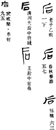 〈辨〉后字商代文字有两体,金文后与司同形,从口、从人,义指发号施令之人,为后1的正字。引申为主司字,详司字下。甲骨文多借用毓字表示,毓象母生子形,引申有后嗣义。后来的金文和篆书都作司的反文,楷书作后。后2的后,原作後,后简化为后。後,从彳从幺从攵,彳表示走,详行字下;攵读suī,为倒止,象示迎面走来;幺读yāo,象足上拴着绳索,所以不能走在前面。