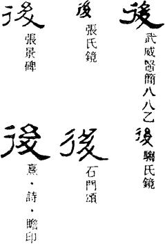 甲骨文、金文的后字,从彳或辵,表示行动;又从倒止(即趾)上有绳索形,象人足有所牵绊。人足有所牵绊,则行动迟缓,后字本义为迟缓,落后。引申指位置在后,与“前”相对;又指时间在后,与“先”相对。
