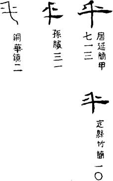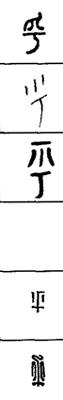 从上到下依次是小篆、甲骨文、金文、古玺及战国文字、缪篆及汉代文字、鸟虫篆。