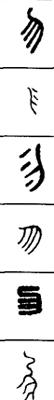 从上到下依次是小篆、甲骨文、金文、古玺及战国文字、缪篆及汉代文字、鸟虫篆。