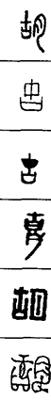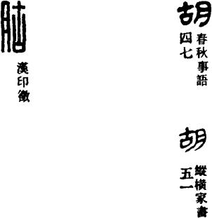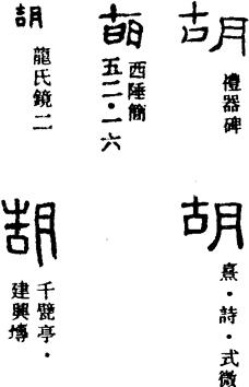 (hán)垂也。”徐锴注:“牛颔下垂皮也。”颔下垂皮与鬍鬚相类,故胡又有鬍鬚义。王力《同源字典》:“鬍是胡的分别字,以别于胡何的胡。”《左传·僖公二十二年》:“虽及胡耉,获则取之,何有于二毛?”(即使涉及长胡子的老人,俘虏了就抓回来,对于头发花白又管什么。耉,寿。二毛,黑白发相间。)《史记·封禅书》:“有龙垂胡髯下迎黄帝。”(有一条龙飘垂着胡须飞下来迎接黄帝。按:《风俗通义》卷二引《封禅书》“胡”作“鬍”。)《汉书·郊祀志》:“黄帝采首山铜,铸鼎于荆山下;鼎既成,有龙垂胡髯下迎黄帝。”(黄帝开采首山的铜矿,在荆山下面铸造铜鼎;铜鼎已经铸成,有一条龙飘垂胡须飞下迎接黄帝。晋灼注:“《地理志》首山属河东蒲阪,荆山在冯翔怀德县也。”)“胡须”义,后来加义符“髟”写作“鬍”,今又简化为“胡”。