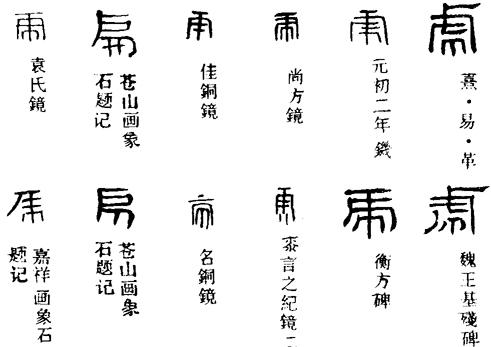 从上到下依次是小篆、甲骨文、金文、古玺及战国文字、缪篆及汉代文字、鸟虫篆。