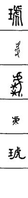 从上到下依次是小篆、甲骨文、金文、古玺及战国文字、缪篆及汉代文字、鸟虫篆。