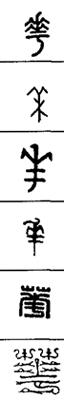 从上到下依次是小篆、甲骨文、金文、古玺及战国文字、缪篆及汉代文字、鸟虫篆。