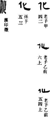 【说明】“化”为会意字,像人一正一倒,取其翻转变化之意。参附录三。