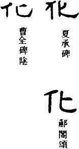 ①改变,变化。《吕氏春秋·察今》:“变法者因时而化。”《淮南子·氾论》:“法与时变,礼与俗化。”引申为生长,化育。《周易·咸》:“天地感而万物化生。”《礼记·乐记》:“和,故百物皆化。”②教化,感化。《礼记·学记》:“君子如欲化民成俗,其必由学乎!”傅玄《晋鼙舞歌·大晋篇》:“化感海外,海外来宾。”(宾:归顺。)又为习俗,风化。《史记·秦始皇本纪》:“黔首改化,远迩同度。”(黔首:百姓。迩:近。)《汉书·叙传下》:“败俗伤化。”③造化,自然的变化或规律。《素问·五常政大论》:“化不可代,时不可违。”陶潜《始作镇军参军经曲阿》:“聊且凭化迁,终返班生庐。”(迁:运转。班生庐:指隐者之居。)④死。《孟子·公孙丑下》:“且比化者无使土亲肤。”(比bì:为。)佛家称死为“坐化”,道家称死为“羽化”,也是这意义。⑤消除。《韩非子·五蠹》:“钻燧取火以化腥臊。”又为消散,消失。《抱朴子·嘉遁》:“名与朝露皆晞,体与蜉蝣并化。”(晞:晒干。)