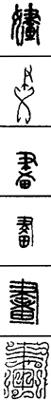 从上到下依次是小篆、甲骨文、金文、古玺及战国文字、缪篆及汉代文字、鸟虫篆。