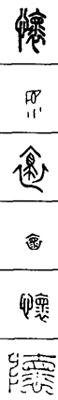 从上到下依次是小篆、甲骨文、金文、古玺及战国文字、缪篆及汉代文字、鸟虫篆。