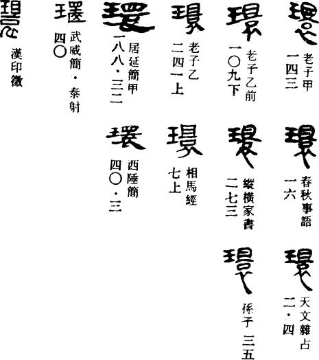 馬王堆帛書《春秋事語·晉獻公欲襲虢章》:“獻公之帀(師)襲郭(虢)環,遂□〔峂〕。”又帛書《戰國縱横家書·李園謂辛梧章》:“秦餘(與)楚為上交,秦禍案環中粱(梁)矣。”“餘(與)趙為上交,秦禍案環歸於趙矣。”影本環讀為還,即反過來。《戰國策·趙策一》:“秦與韓為上交,秦禍安移於梁矣。”移即還轉也。又馬王堆帛書《老子》乙本卷前古佚書《十六經·姓爭》:“天道環於人,反為之客。”又《十六經·兵容》:“三遂絶從,兵有成〔功〕,□不鄉(饗)其功,環受其央(殃)。”按《史記·刺客列傳》:“秦王環柱而走。”環《戰國策·燕策三》作還。