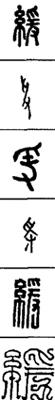 从上到下依次是小篆、甲骨文、金文、古玺及战国文字、缪篆及汉代文字、鸟虫篆。